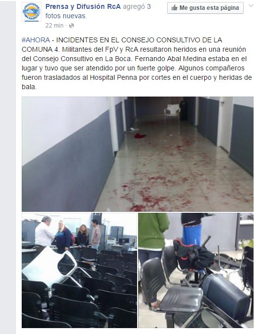 | Urgente: Militantes PRO agredieron al FPV a cuchillazos (140 puntos) Posted: 04 May 2016 06:56 PM PDT MILITANTES MACRISTAS CERCANOS A ANGELICI AGREDIERON CON ARMAS BLANCAS Personas que responden a punteros del PRO en La Boca y Villa 21-24 agredieron ferozmente a militantes y vecinos durante la reunión del Consejo Consultivo de la Comuna 4 (La Boca, Barracas, Nueva Pompeya y Parque Patricios) que se estaba llevando a cabo en la tarde del miércoles 4 de mayo en la Sede Comunal mientras se intentaba plantear una discusión sobre los terrenos de Casa Amarilla. |
